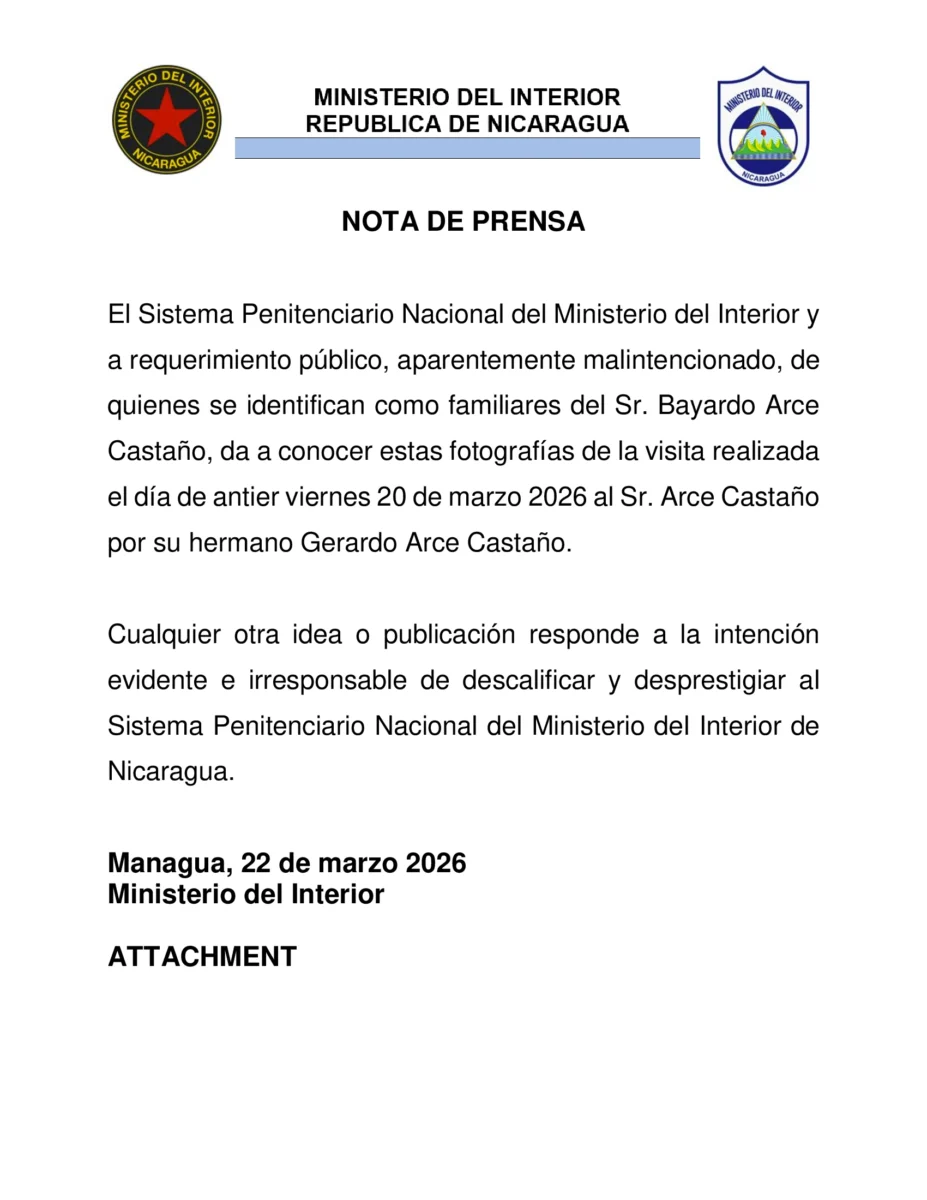 El Sistema Penitenciario Nacional del Ministerio del Interior y a requerimiento público, aparentemente malintencionado, de quienes se identifican como familiares del Sr. Bayardo Arce Castaño, da a conocer estas fotografías de la visita realizada el día de antier viernes 20 de marzo 2026 al Sr. Arce Castaño por su hermano Gerardo Arce Castaño.