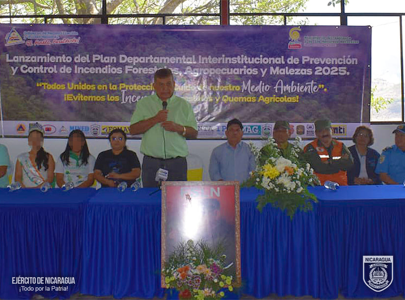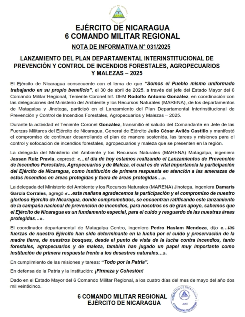 El Ejército de Nicaragua consecuente con el lema de que “Somos el Pueblo mismo uniformado trabajando en su propio beneficio”, el 30 de abril de 2025, a través del jefe del Estado Mayor del 6 Comando Militar Regional, Teniente Coronel Inf. DEM Rodolfo Antonio González, en coordinación con las delegaciones del Ministerio del Ambiente y los Recursos Naturales (MARENA), de los departamentos de Matagalpa y Jinotega, participó en el Lanzamiento del Plan Departamental Interinstitucional de Prevención y Control de Incendios Forestales, Agropecuarios y Malezas – 2025.
