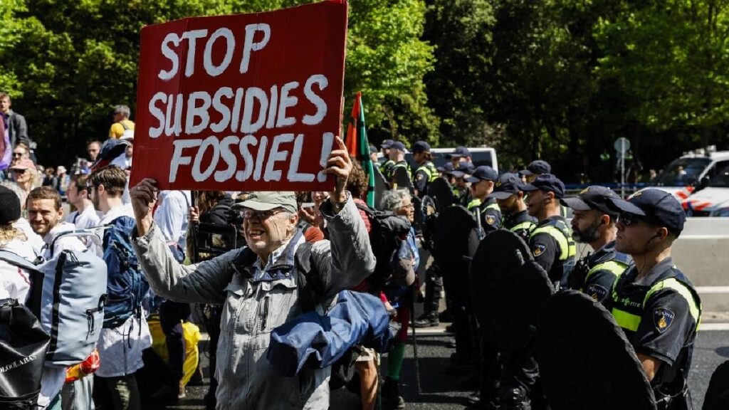 Esta protesta es contra las subvenciones a los combustibles fósiles, por lo que se puede apreciar a los activistas con carteles como “¡Autopista al infierno climático!”.