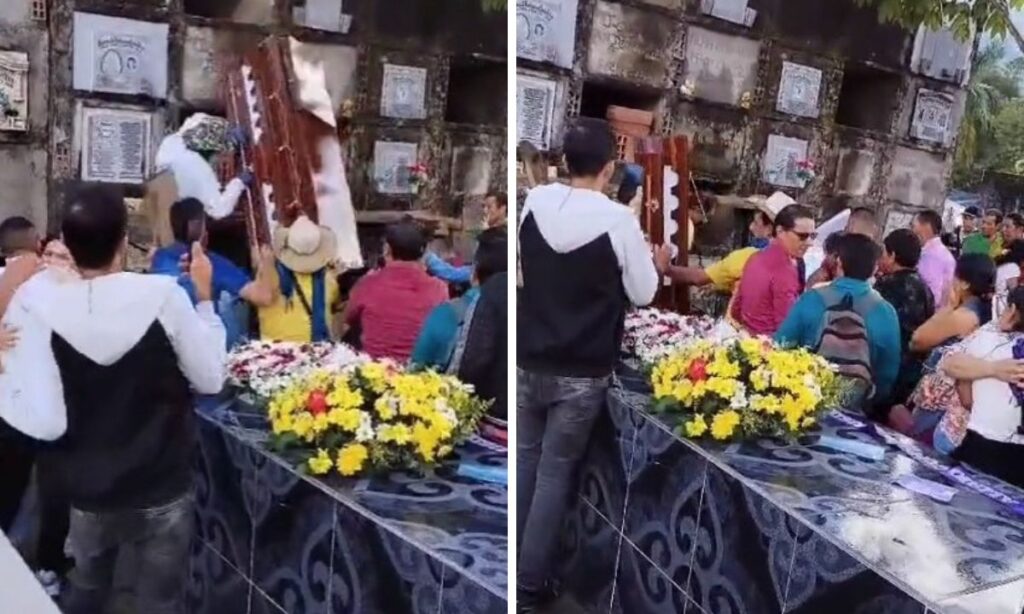 En medio de un sepelio uno de los asistentes grabó el momento en el que estaban tratando de meter el ataúd en un mausoleo ubicado a unos 3 metros del suelo; sin embargo, el andamio que utilizaron para alcanzar la tumba se cayó.