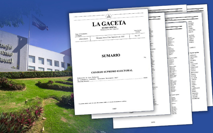 El Consejo Supremo Electoral (CSE) de Nicaragua, este 22 de septiembre, ha efectuado a través de La Gaceta, Diario Oficial, la publicación definitiva de candidatos y candidatas a Alcaldes o Alcaldesas, Vicealcaldes o Vicealcaldesas y Miembros de los Concejos Municipales de los 153 Municipio del país.