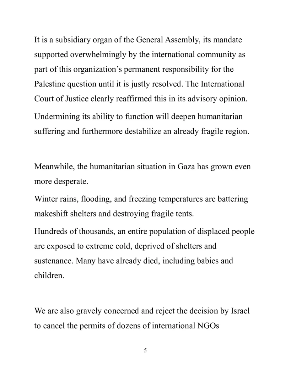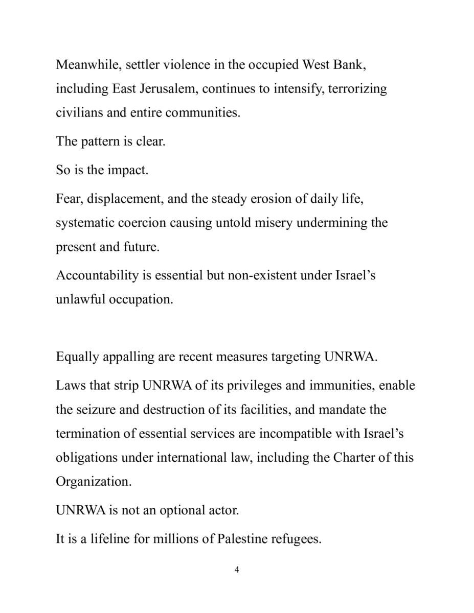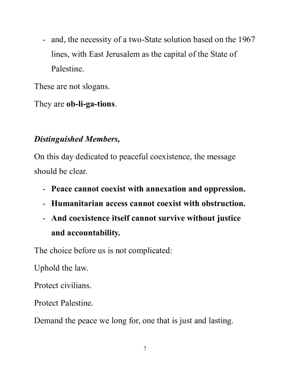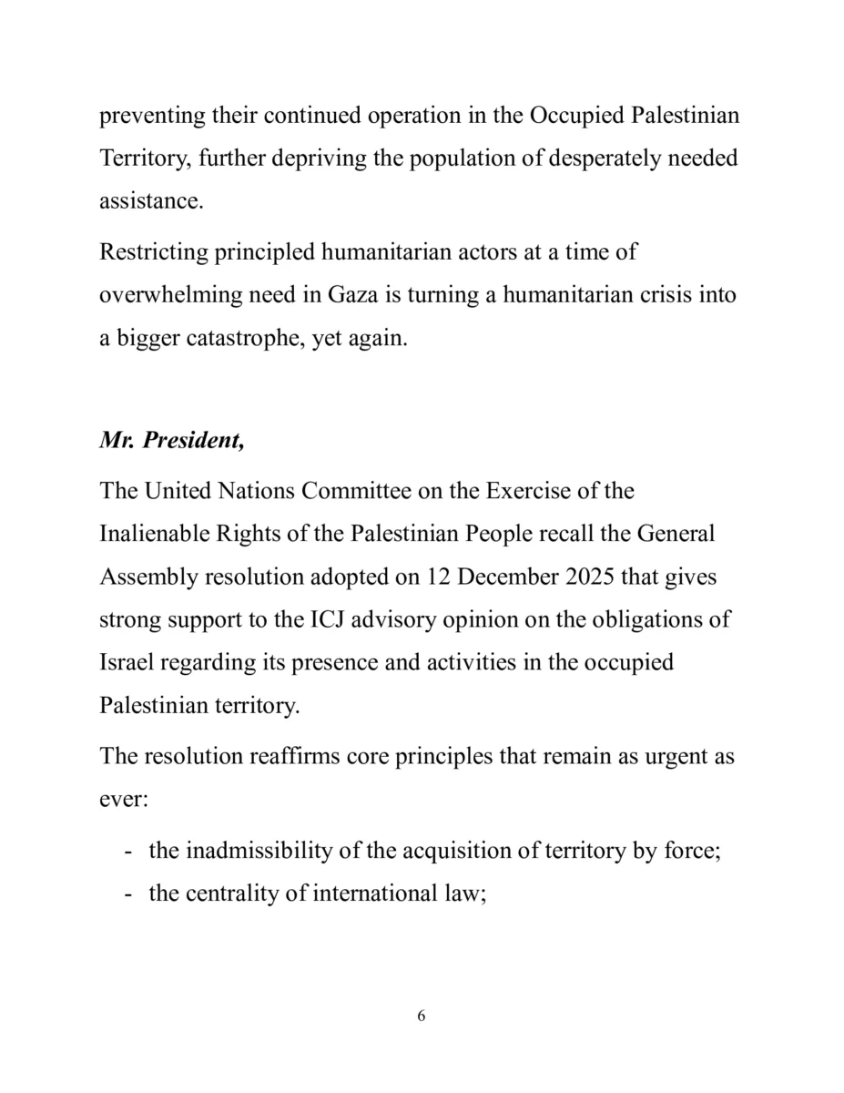 Reiteró las obligaciones de Israel especificadas en la resolución de la Asamblea General aprobada el 12 de Diciembre de 2025, que apoya firmemente la opinión consultiva de la Corte Internacional de Justicia en relación con su presencia y sus actividades en el territorio palestino ocupado.
