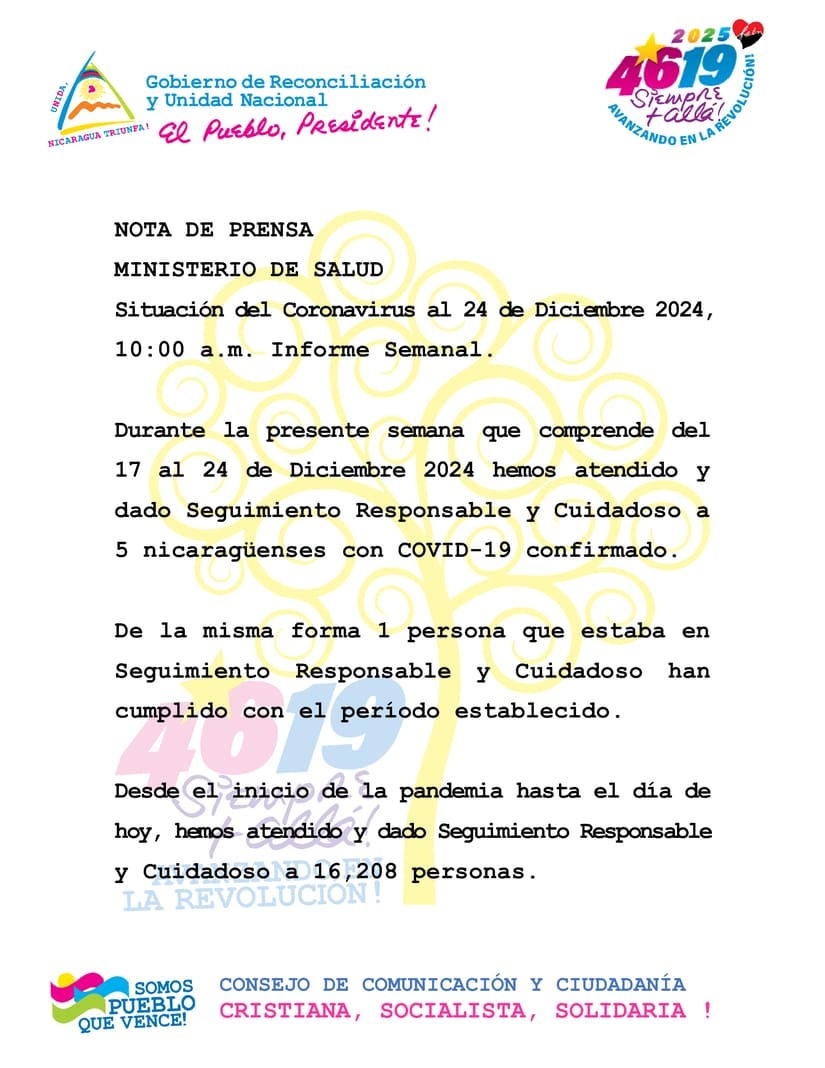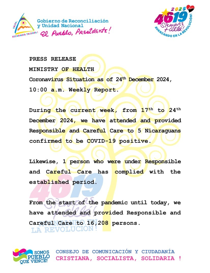 During the current week, from 17th to 24th December 2024, we have attended and provided Responsible and Careful Care to 5 Nicaraguans confirmed to be COVID-19 positive.