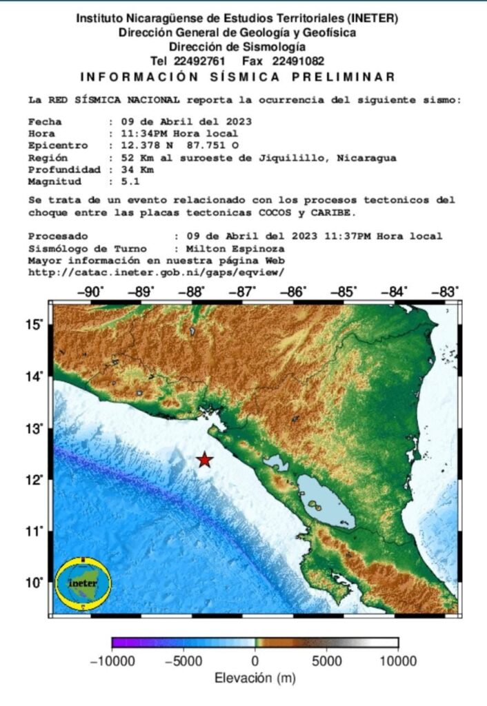 El Instituto Nicaragüense de Estudios Territoriales (INETER), reportó un sismo de 5.1 grados de magnitud a 52 km del sur oeste de Jiquilillo.