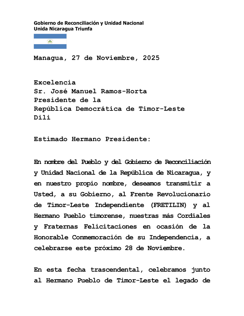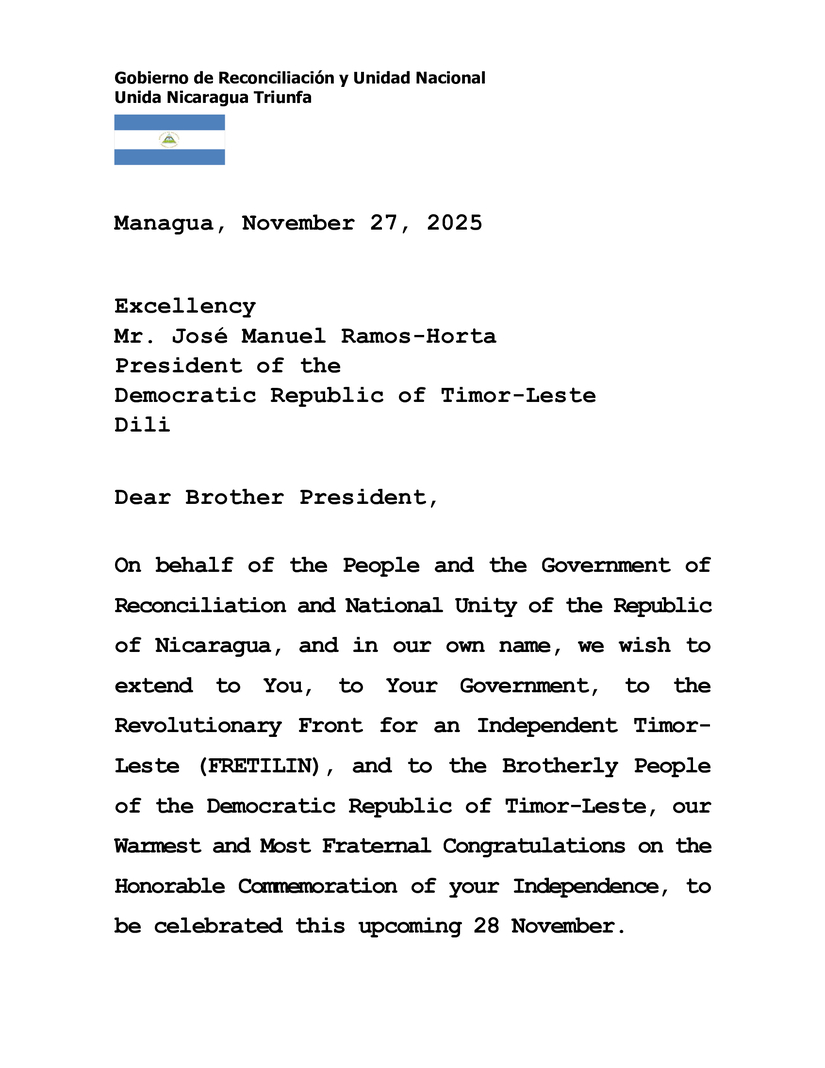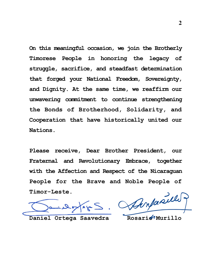 On behalf of the People and the Government of Reconciliation and National Unity of the Republic of Nicaragua, and in our own name, we wish to extend to You, to Your Government, to the Revolutionary Front for an Independent Timor-Leste (FRETILIN), and to the Brotherly People of the Democratic Republic of Timor-Leste, our Warmest and Most Fraternal Congratulations on the Honorable Commemoration of your Independence, to be celebrated this upcoming 28 November.
