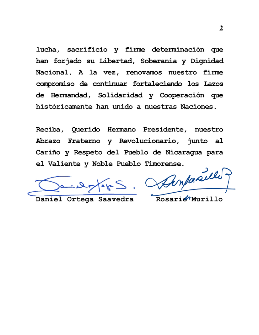En nombre del Pueblo y del Gobierno de Reconciliación y Unidad Nacional de la República de Nicaragua, y en nuestro propio nombre, deseamos transmitir a Usted, a su Gobierno, al Frente Revolucionario de Timor-Leste Independiente (FRETILIN) y al Hermano Pueblo timorense, nuestras más Cordiales y Fraternas Felicitaciones en ocasión de la Honorable Conmemoración de su Independencia, a celebrarse este próximo 28 de Noviembre.