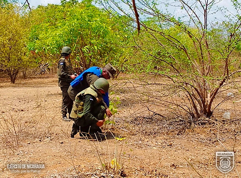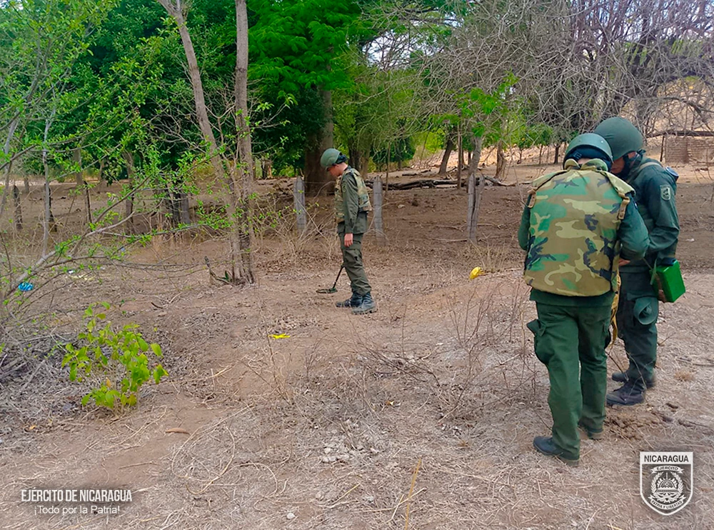 El Ejército de Nicaragua consecuente con el lema de que “Somos el Pueblo mismo uniformado trabajando en su propio beneficio”, el 24 de abril de 2026, a través del 2 Comando Militar Regional y el Cuerpo de Ingenieros “General de Brigada Miguel Ángel Ortez y Guillen”, realizaron reconocimiento, evacuación y voladura de artefactos explosivos, reportados por pobladores y efectivos de la Policía Nacional, en diferentes lugares del departamento de Chinandega, siendo los siguientes: